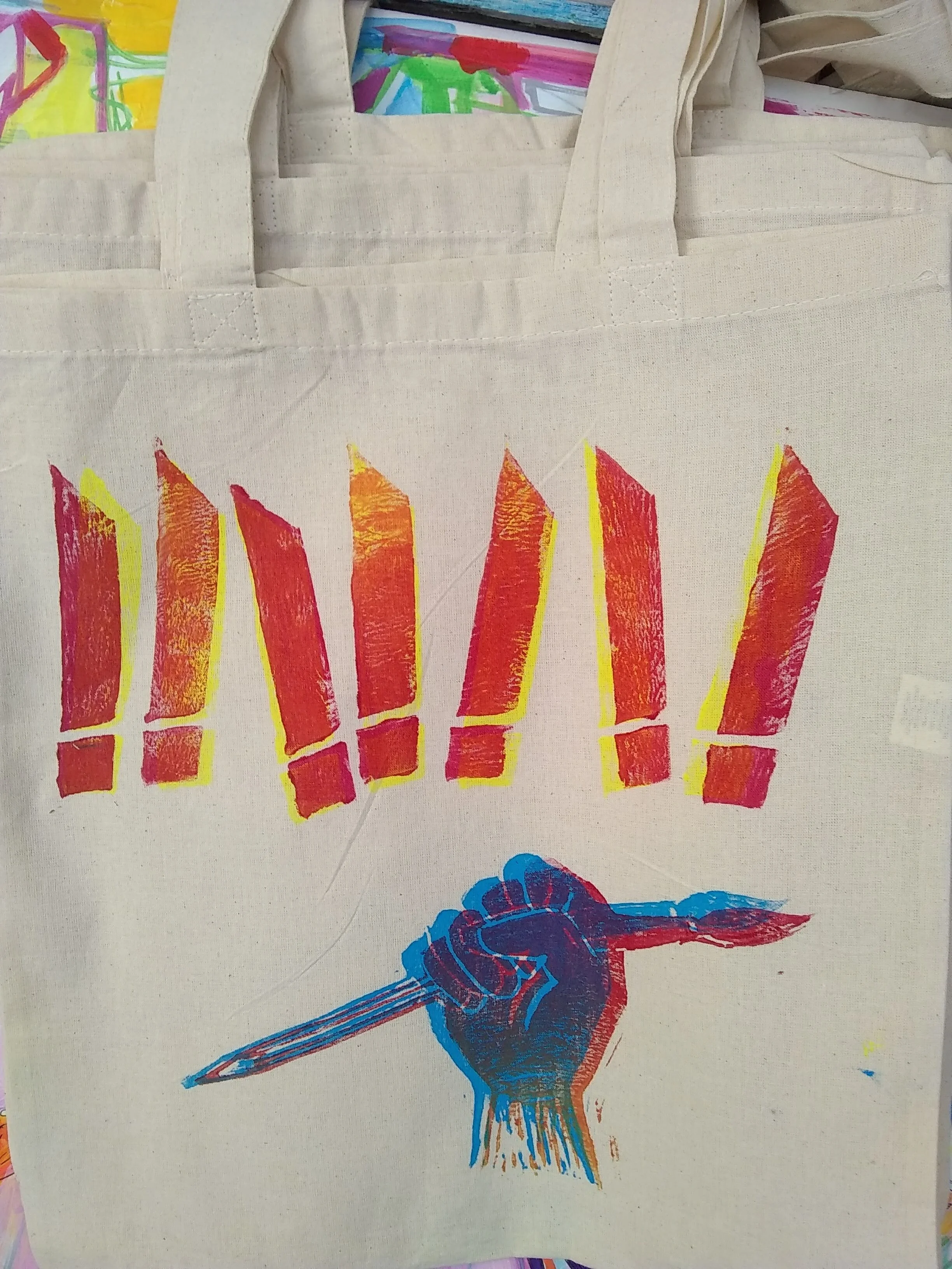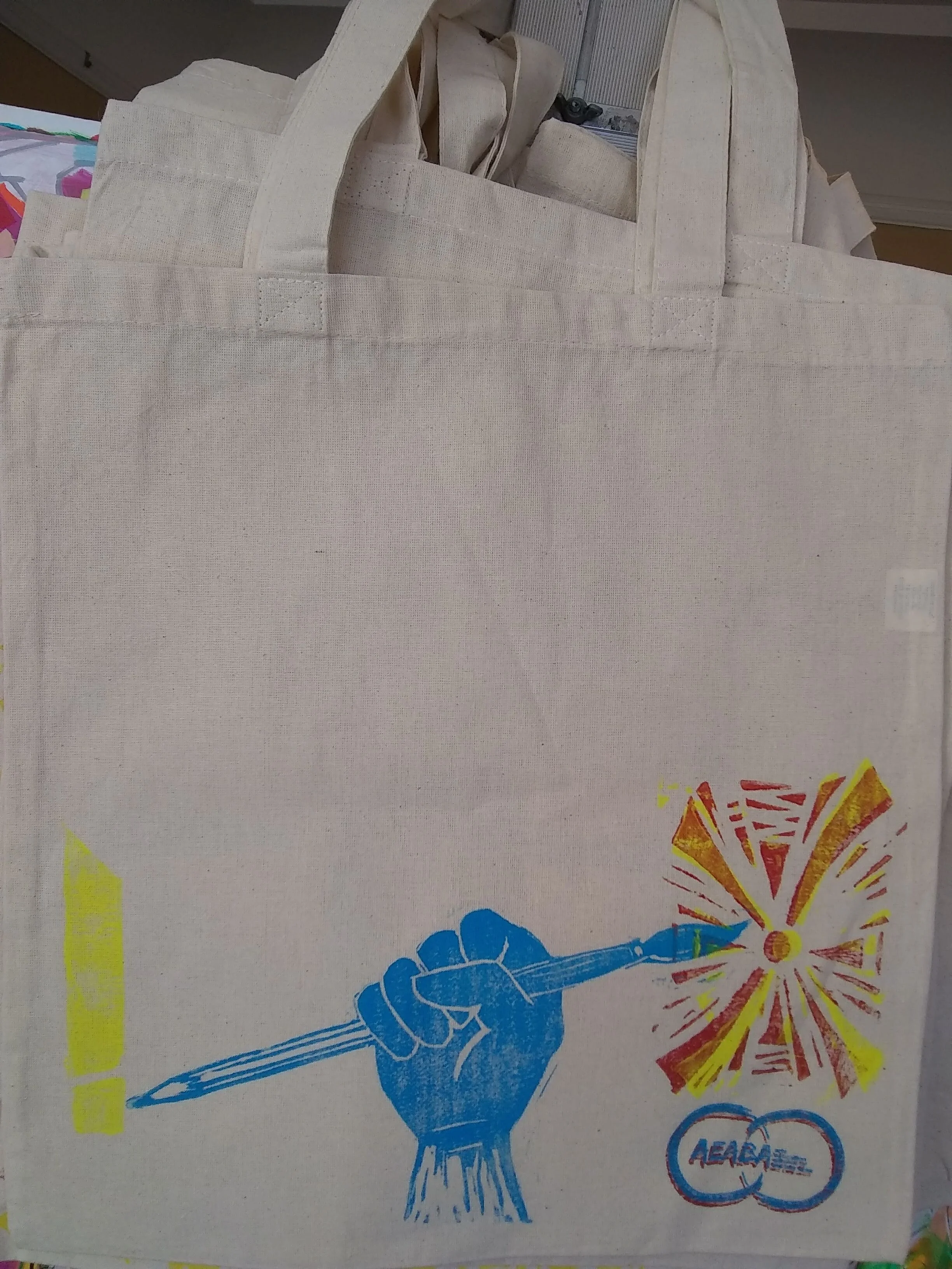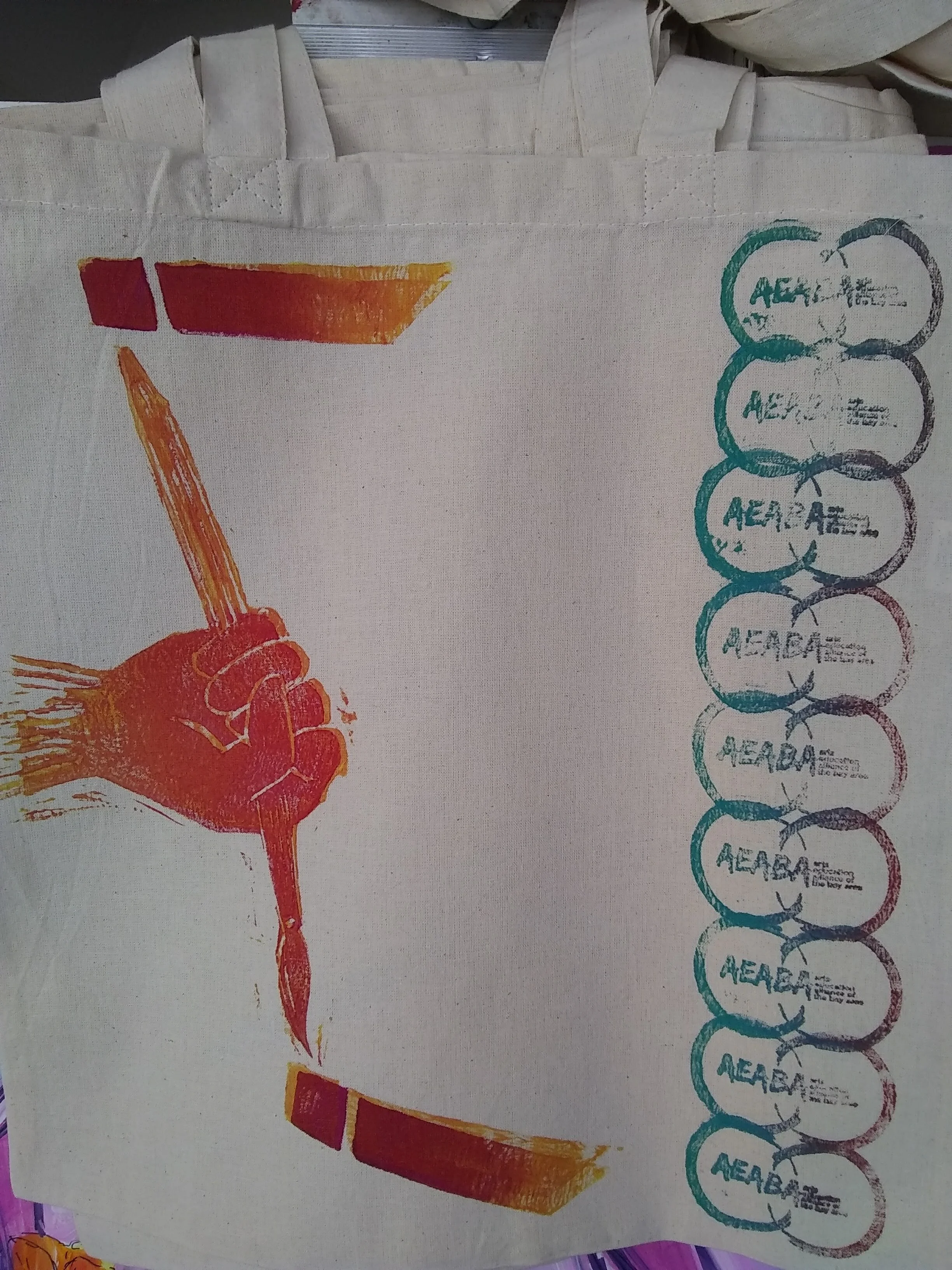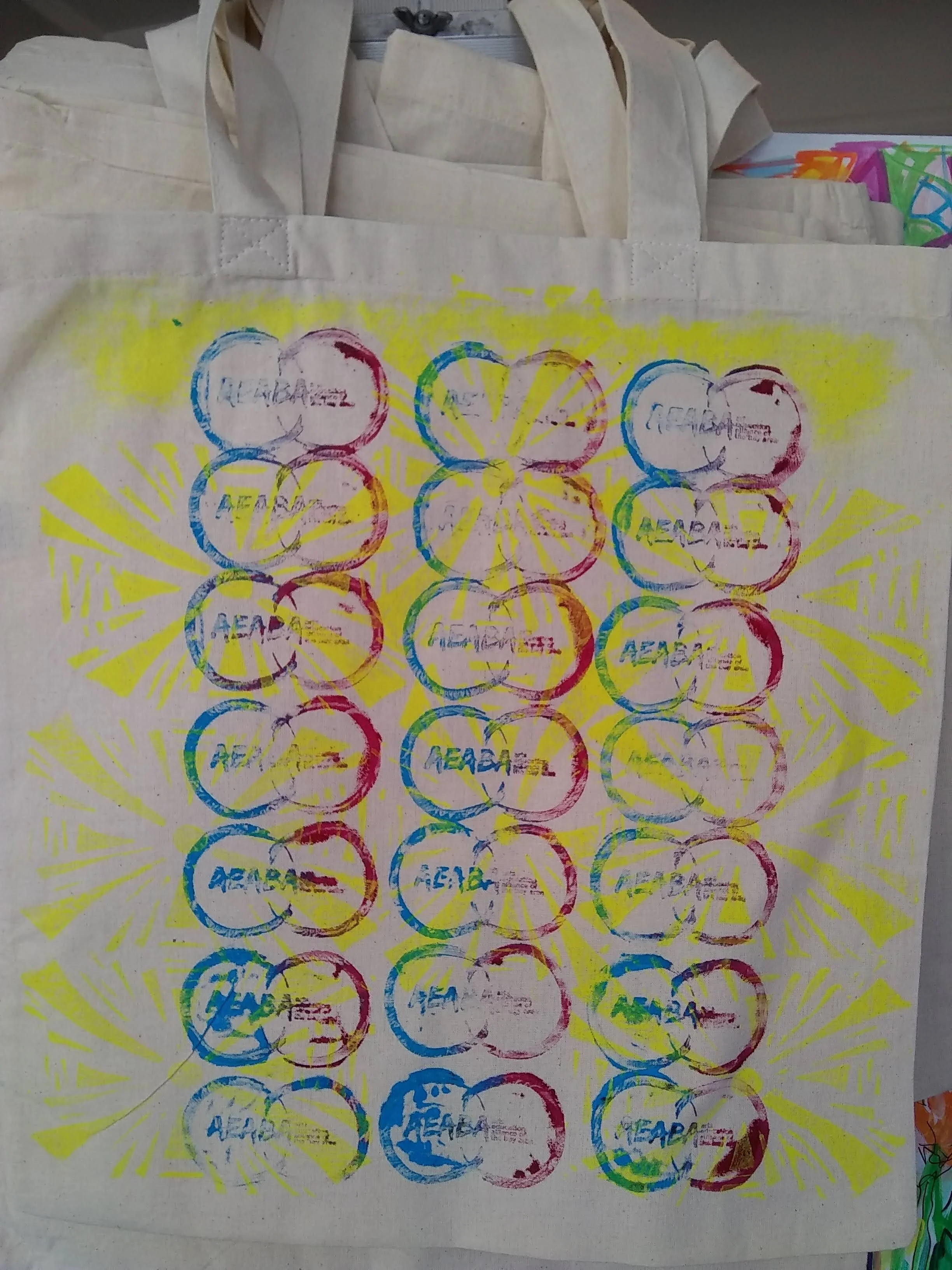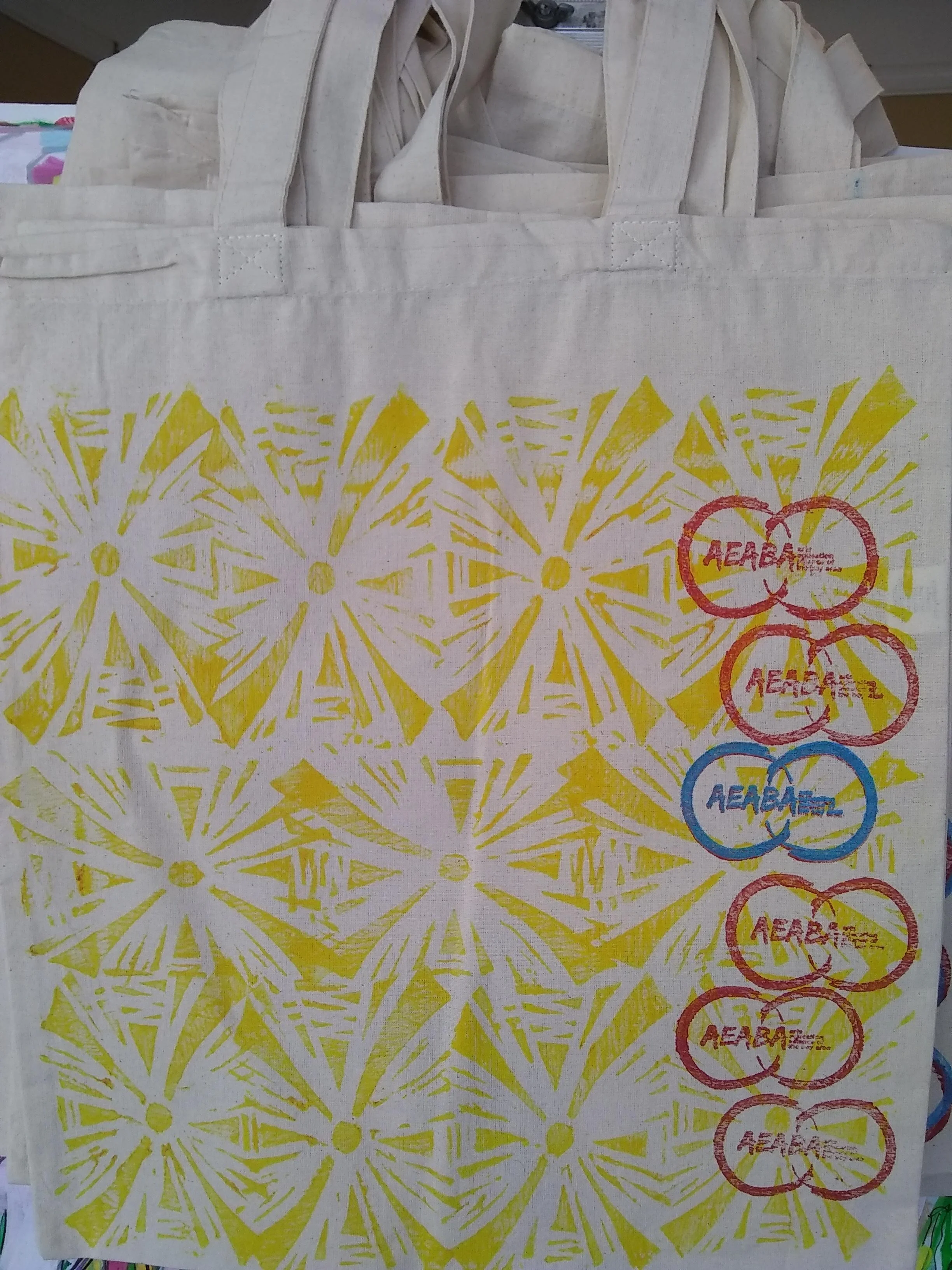 Upon stepping aside from my position as Executive Director the Arts Education Alliance of the Bay Area (AEABA), I created a series of 32 unique block prints on canvas tote bags. Each bag is signed and numbered. They were created using water-based fabric printing ink that has been heat-set with an iron, so the colors should survive washing.